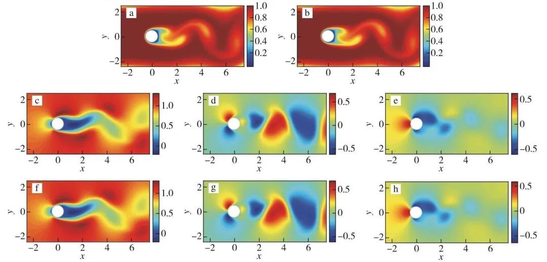圖3 通過圓柱體矩形訓(xùn)練區(qū)域的二維流動:(a)輸入的濃度;(b)人工智能模型回歸出的濃度。根據(jù)納維-斯托克斯方程由圖(b)回歸出來的速度場u(c)、v(d)和壓力場p(e)以及用來對照的同一時刻速度場u(f)、v(g)和壓力場p(h)。其中橫縱坐標(biāo)表示二維流動的方向,數(shù)值分別表示沿著x,y方向的位移。引自Raissi et al. (2020)