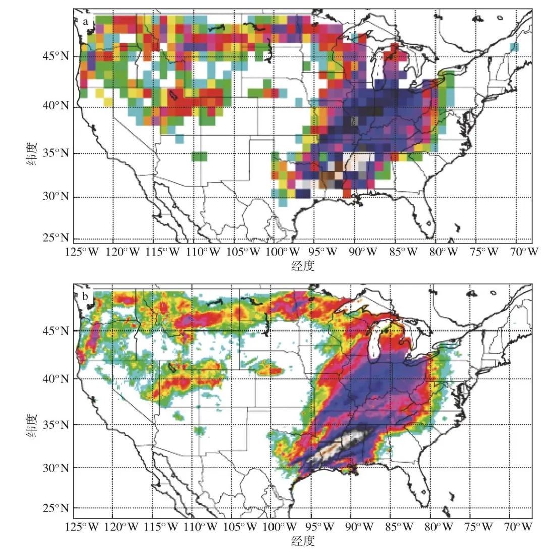 圖6 降水分布:低分辨率1.0°(a,約100 km)和通過DeepSD降尺度后高分辨率1/8°(b,約12.5 km)的結(jié)果(引自Vandal et al., 2017)