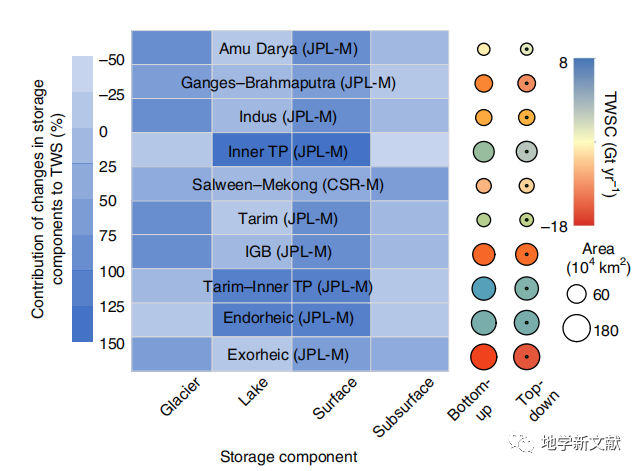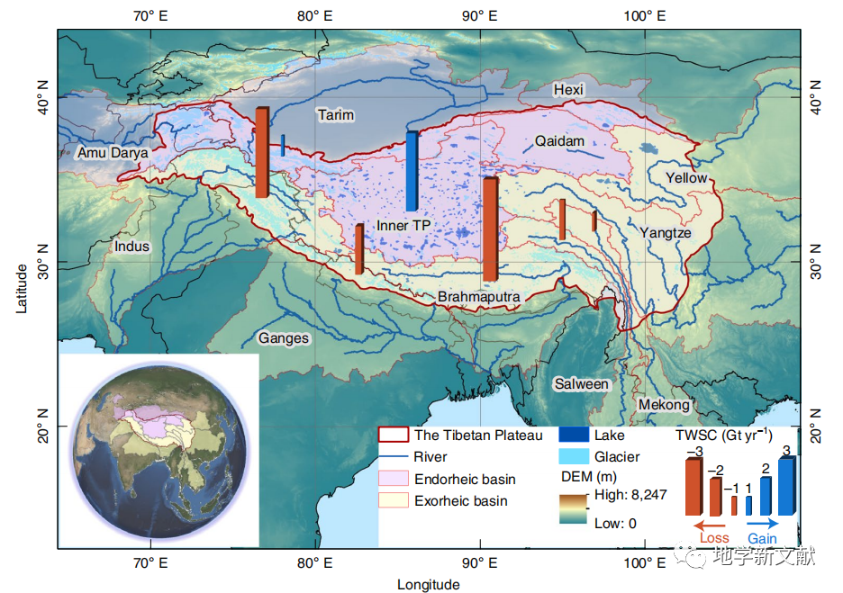 青藏高原(TP)作為亞洲的水塔,滿足了近20億人的大部分水需求。獨特的高海拔地形和以季風(fēng)和高空西風(fēng)為主的大氣環(huán)流為該地區(qū)帶來了寶貴的淡水資源。陸地儲水量(TWS)包括所有形式的地表水和地下水,在水文運輸和水可用性等方面至關(guān)重要。但TWS對氣候變化高度敏感,易受極端氣候的影響。整個青藏高原的長期TWS變化主要是由冰川質(zhì)量平衡、湖泊體積變化和地下水變化引起。過去二十幾年中,氣候逐漸變暖且濕潤,青藏高原的TWS也發(fā)生了明顯變化。盡管TWS的變化是全球水塔脆弱性的一個關(guān)鍵指標(biāo),過去的研究受限于觀測和模擬的不確定性,仍未充分探索歷史氣候和未來氣候?qū)WS的影響。且以往研究大多僅限于TWS的一部分(如,冰川質(zhì)量或湖水儲存),或使用單種方法對其進行量化(如,觀測分析、遙感建模或診斷分析)。在過去二十幾年中,GRACE和GRACE‒FO衛(wèi)星產(chǎn)品逐漸成熟,為大規(guī)模量化TWS的變化提供了前所未有的機會。