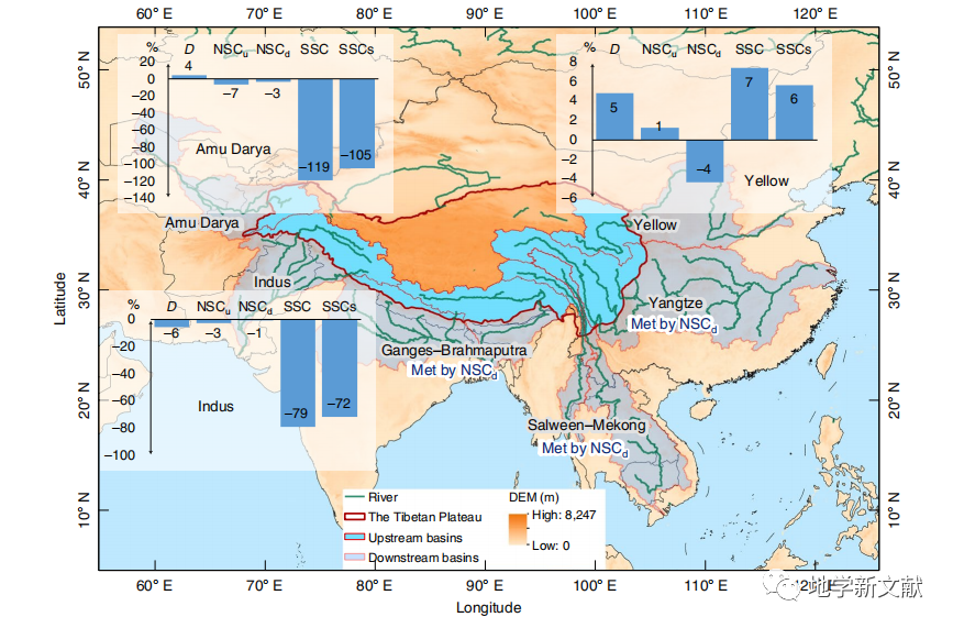 為探究TWS變化對水資源供需方面的影響,作者考慮了兩種水源,即自然供水能力(NSC,定義為降水減去實際蒸散量)和儲存供水能力(SSC,定義為上游地區(qū)的TWS)。研究結(jié)果發(fā)現(xiàn),阿姆河及印度河流域未來的NSC略有下降,SSC分別下降約120%和80%(圖4),但其工業(yè)和生活用水需求均在增加,說明這兩個盆地可能成為“亞洲水塔”水資源短缺最嚴(yán)重的地區(qū)。黃河流域雖然也依賴于上游供水,但氣候變化下上游的供水能力有所提高,使得未來黃河流域的水資源供需平衡較為穩(wěn)定。