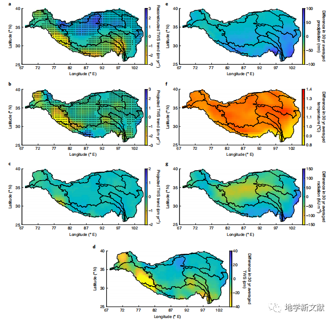 基于機器學(xué)習(xí)的未來預(yù)測結(jié)果發(fā)現(xiàn),在中等共享社會經(jīng)濟路徑‒典型濃度路徑組合情景下(SSP2‒4.5),到21世紀(jì)中期,大多數(shù)青藏高原盆地的TWS下降幅度將大大減少,但阿姆河和印度河盆地可能繼續(xù)經(jīng)歷持續(xù)的TWS損失,成為未來TWS短缺的熱點地區(qū)(圖3)。雖然總體上青藏高原未來的TWS下降趨勢將變緩,水儲量可能達(dá)到“新平衡”,但未來的TWS損失仍顯著,達(dá)2300億m3。這些變化主要受到降水、溫度和表面短波輻射的綜合影響。在21世紀(jì)初至中期期間,中國太平洋地區(qū)大部分地區(qū)的年降水量穩(wěn)定,恒河‒雅魯藏布江和薩爾溫‒湄公河地區(qū)水量有所增長(圖3e)。整個青藏高原出現(xiàn)變暖趨勢,沒有顯著熱點(圖3f),但阿姆河流域和印度河流域可能對氣候變暖更加敏感。