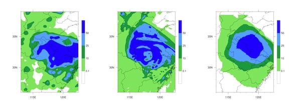 圖說:2021年7月27日8時到28日8時臺風“煙花”帶來的降水預報和實測比對(a為觀測,b為數(shù)值預報,c為人工智能預報)